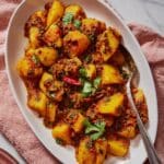 - Mash and Garnish: Lightly mash a few potatoes in the pan to thicken the gravy while keeping most potatoes whole. Sprinkle fresh coriander leaves on top before serving.