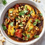 - Step 7: When ready to serve, sprinkle with chopped coriander and toasted pine nuts or almonds. Serve with crusty bread on the side to soak up the delicious sauce.