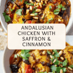 Keywords: Andalusian chicken, saffron chicken, cinnamon chicken stew, Spanish chicken recipe, chicken with raisins, chicken with pine nuts, Mediterranean chicken