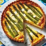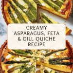 A savory asparagus, feta, and dill quiche featuring a buttery homemade pastry crust filled with a creamy mixture of double cream, crème fraîche, and eggs, complemented by tender asparagus, tangy feta cheese, and fresh dill for a delightful springtime meal.