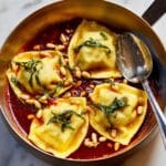 This recipe for Beef & Sour Cherry Manti with Tomato-Chilli Butter features traditional Turkish-style dumplings filled with a flavorful mix of beef mince, sour cherries, and fragrant spices. The delicate manti dough is handmade and paired with a vibrant tomato and chilli butter sauce, served alongside tangy Greek yogurt and toasted pine nuts for a delightful balance of textures and tastes.