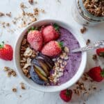 - Assemble the Breakfast Bowl: Pour the blended mixture into a bowl. Then, decorate the top with a handful of honey granola, sliced plums, and fresh strawberries to add texture, sweetness, and fresh flavors.
