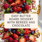 This Butter Board Dessert version offers a delightful twist on the traditional butter board by incorporating whipped cream cheese with mixed fresh berries, nuts, chocolate, and sweet drizzles. It’s an elegant, no-bake dessert perfect for sharing, featuring a creamy base topped with vibrant berries, crunchy nuts, and sweet accents, all served with toasted baguette or brioche slices for spreading.