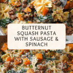 This Butternut Squash Pasta with Sausage and Spinach combines creamy roasted butternut squash, savory Italian sausage, and tender spinach for a comforting and flavorful meal. The roasted squash adds a natural sweetness and creaminess that complements the spicy sausage and fresh greens, tossed together with al dente pasta and finished with Parmesan cheese and a hint of sage.