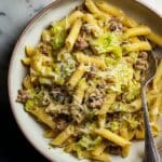 A flavorful and hearty pasta dish featuring charred hispi cabbage and savory crumbled sausage, brought together with creamy crème fraîche, wholegrain mustard, and topped with grated parmesan for a deliciously comforting meal.