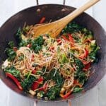 - Add Sauce: Pour in the soy sauce, rice wine or white wine vinegar, and add the zest and juice of the lime. Add enough water to create a light sauce that clings to the noodles, chicken, and vegetables. Toss everything together and heat through briefly.