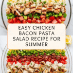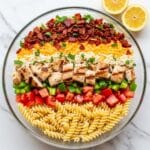 - Assemble the Salad: In a large bowl, add the cooled pasta and toss with ¼ cup of Italian dressing. Add the seared chicken pieces and another ¼ cup dressing, tossing to coat evenly. Add the halved cherry tomatoes, diced bell peppers, and remaining ¼ cup dressing. Toss again. Add half of the chopped bacon and shredded cheddar cheese, mixing gently.