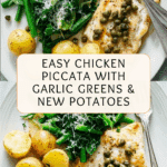 Keywords: Chicken Piccata, lemon chicken, capers, garlicky greens, new potatoes, easy dinner, Italian chicken recipe