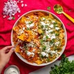 - Combine Chips and Sauces: Divide the fried tortilla chips into two halves. Toss half the chips quickly in the red sauce and the other half in the green sauce, coating them evenly.