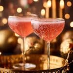 Two tall, elegant clear glasses with delicate swirl patterns etched around the bowls hold a pink drink with a slightly frothy texture on top. The glasses stand side by side on a shiny, round golden tray with ornate circular designs along its edge. The background has soft, warm round lights creating a cozy, festive feeling. The overall scene is warm and inviting with shiny golden candle holders in the background. Photo taken with an iphone --ar 4:5 --v 7