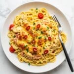This comforting Chicken Spaghetti recipe features tender seared chicken breasts tossed in a rich, creamy cheese sauce with diced tomatoes and green chilies, combined with perfectly cooked thin spaghetti, then baked to bubbly perfection and topped with melted mozzarella. It’s a delicious, hearty casserole ideal for a family dinner.