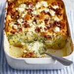 - Step 6: Top the lasagne with spoonfuls of the remaining ricotta and scatter over the rest of the cheddar cheese.