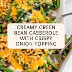 Keywords: green bean casserole, cheesy green beans, holiday side dish, mushroom cream sauce, crispy fried onions, classic casserole