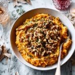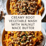 This Crushed Roots with Walnut & Mace Butter dish is a comforting and flavorful way to enjoy a variety of root vegetables. The combination of celeriac, swede, carrots, and sweet potatoes creates a hearty mash, elevated by a fragrant walnut and mace butter topping.