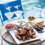 A white plate on a white marbled surface holds grilled chicken wings stacked in a pile, showing a crispy charred brown and golden color. Next to it, a small bowl filled with a colorful red tomato salsa with green herbs is placed on the same white plate. Another bowl of creamy white sauce topped with green herbs sits beside the salsa. In front, a small bowl of light beige pistachios is arranged on the plate. On the right side, a white plate holds soft pita bread stacked in the back, with a small bowl of green and black olives, and dates arranged neatly beside it. Two clear martini glasses with a silver liquid and ice cubes stand in the background. All items rest on a round table with a wooden top near a blue pool with gentle water reflections, and a blue chair with white bird shapes is seen in the background. Photo taken with an iphone --ar 4:5 --v 7