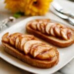 Two slices of toasted bread rest on a white plate over a white marbled surface, each topped with evenly spaced, caramelized apple slices arranged in overlapping rows. The bread has a golden-brown crust with a slightly textured, soft center visible under the fruit. The apple slices are glossy with a warm, amber color, showing a tender, slightly cooked texture. In the background, a blurred yellow flower adds a warm touch, while a fork and knife lie near the plate. Photo taken with an iphone --ar 4:5 --v 7