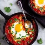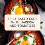 Keywords: spicy baked eggs, harissa eggs, shakshuka style, baked eggs recipe, easy brunch recipe, North African eggs, tomato and egg bake
