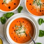 This Easy Tomato Gazpacho Recipe is a refreshing, no-cook Spanish-style cold soup made from fresh Campari tomatoes, basil, and a splash of white wine vinegar. Blended until smooth and served chilled with optional Parmesan cheese, extra virgin olive oil, and balsamic glaze, it is perfect for a light summer appetizer or a cooling weekday meal.