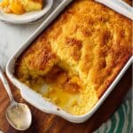 The image shows a rectangular white baking dish filled with golden brown baked cornbread, with a square section missing from the bottom left corner revealing a layer of bright orange, gooey cooked peaches underneath. The cornbread top layer looks crumbly and slightly rough in texture, while the peach layer appears soft and juicy. A silver spoon with some of the dessert on it rests on a wooden board next to the dish. In the background, there is a white plate holding a piece of the cornbread with peach filling, and a white marbled surface is under the baking dish. A green and white striped cloth is partly visible near the bottom right corner. photo taken with an iphone --ar 4:5 --v 7