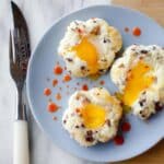 Eggs in Clouds with Sriracha Caviar is a stunning twist on classic baked eggs. Fluffy egg whites loaded with cheese and bacon cradle the yolk, topped with spicy, tangy sriracha pearls for a unique burst of flavor. This dish is as delightful to look at as it is to eat.