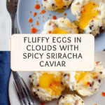 Eggs in Clouds are best enjoyed fresh. If you must store leftovers, keep them in an airtight container in the refrigerator for up to 1 day. Reheat gently in a low oven (about 300°F/150°C) for 5–7 minutes to avoid overcooking the yolks. Sriracha caviar is best used fresh but can be stored in the fridge for up to 24 hours in water, drained and rinsed before use.