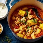 This flavorful Fajita Chicken One-Pot recipe combines succulent chorizo and tender chicken thighs with vibrant red onions, Romano peppers, pinto beans, and potatoes, all simmered together in a rich chicken stock infused with fajita seasoning. Finished with sweet corn on the cob and served with cooling soured cream and fresh parsley, this hearty and comforting dish is perfect for an easy, all-in-one meal.