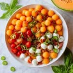 A bright and refreshing Fresh Melon Salad combining sweet Tuscan melon balls, creamy mozzarella, briny Castelvetrano olives, juicy cherry tomatoes, fragrant fresh basil, and crispy prosciutto, all tossed in a light honey and white balsamic dressing. Perfect as a light lunch or appetizer, ready in just 15 minutes.