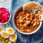 A white bowl filled with thick orange-brown curry that has visible chunks and a slightly creamy texture sits at the top, with a large piece of flatbread resting partially on the edge of the bowl. Below it, there is a white small bowl with three halved boiled eggs showing their bright yellow yolks, and beside it, a white bowl holding vibrant pink pickled cubes, pale green peppers, and a wedge of yellow lemon. All the bowls are placed on a soft blue fabric over a white marbled surface. photo taken with an iphone --ar 4:5 --v 7
