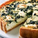 A close-up image of a spinach and cheese tart with one slice cut out and slightly pulled away, showing a golden brown crust on the bottom and sides that looks flaky and thick. The top layer is creamy white cheese with scattered, wilted dark green spinach leaves mixed in, creating a marbled effect. The tart rests on a white plate, which sits on a white marbled surface. The overall look is fresh and savory, with a smooth texture on top and a crisp crust at the bottom. Photo taken with an iphone --ar 4:5 --v 7