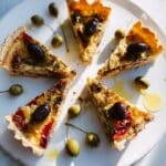 7. Cool and Serve: Remove the tart from the oven and cool on a wire rack. Once slightly cooled, carefully remove from the tin and slice. Serve warm or at room temperature, optionally garnished with scattered caper berries.