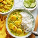 A vibrant and flavorful Golden New Potato & Pea Curry featuring a fragrant spice paste with galangal, lemongrass, and turmeric, simmered in creamy coconut milk with tender new potatoes and fresh peas. Perfectly balanced with lime juice and served over sticky jasmine rice, this curry offers a delightful blend of textures and aromatic spice.
