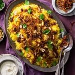 Keywords: spiced pilaf, basmati rice, crispy shallots, saffron yogurt, Middle Eastern rice, nut pilaf, aromatic rice dish