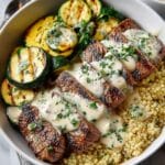 - Assemble: Spoon the cooked grains into serving bowls. Top with the grilled zucchini slices and sliced steak. Drizzle generously with the creamy garlic sauce before serving to enhance flavor.