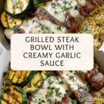 Keywords: grilled steak bowl, creamy garlic sauce, quinoa bowl, grilled zucchini, healthy steak recipe, easy dinner bowl