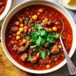 Harira is a traditional Moroccan soup that’s hearty and flavorful, combining tender braised beef, chickpeas, lentils, and fresh vegetables with warming spices like turmeric, ginger, and saffron. This rich and velvety soup is perfect for warming up on cooler days and is traditionally served with fresh lemon wedges and coriander for a bright, zesty finish.