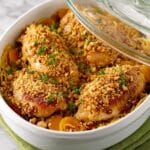 A flavorful Harissa-spiced chicken dish served with nutty bulgur wheat, toasted pine nuts, sweet apricots, and fresh coriander. This vibrant North African-inspired meal is simple to prepare on the stovetop, offering a perfect balance of spice, texture, and freshness.