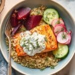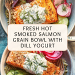 Keywords: hot smoked salmon, grain bowl, quinoa bowl, dill yogurt, pickled vegetables, healthy lunch, easy dinner