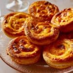 The image shows six round pastries with a spiral shape, placed on a clear glass plate. Each pastry has a golden-brown flaky crust forming the outer layer, with a slightly puffed texture and visible layers of dough. Inside, there is a rich orange layer of melted cheese or filling with some darker browned spots on the surface, giving a slightly crispy appearance. The pastries are arranged closely together, with some overlapping slightly. The plate rests on a smooth white marbled surface, and two wine glasses with liquid inside are partially visible in the background. photo taken with an iphone --ar 4:5 --v 7