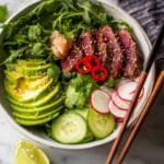 - Step 5: Add sliced avocado, radishes, and cucumbers to the bowl. Season with sea salt and sprinkle sesame seeds on top.