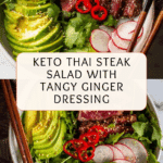 This Keto Thai Steak Salad combines tender, thinly sliced ribeye steak with fresh arugula, crunchy vegetables, and a flavorful Thai-inspired dressing made with pickled ginger, sesame oil, and coconut aminos. It’s a quick, low-carb, and nutritious meal perfect for lunch or dinner that balances savory, tangy, and slightly spicy flavors.