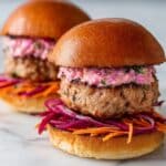 These lamb and quinoa burgers are a delicious and hearty meal combining lean lamb mince with nutritious quinoa, served with a refreshing beetroot tzatziki and a crisp carrot and onion salad. Perfectly balanced with fresh herbs and vibrant flavors, these burgers are ideal for a wholesome lunch or dinner, served in pitta bread, wraps, or burger buns.
