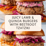 These lamb and quinoa burgers are a fresh and flavorful twist on the classic burger, featuring tender lamb mince combined with nutty quinoa. Served with a vibrant beetroot tzatziki and crunchy carrot salad, they make a delicious, wholesome meal perfect for any day of the week.