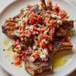 The dish shows five grilled lamb chops stacked and spread slightly on a white plate, each chop having a browned and slightly charred texture with visible grill marks and curved bones. On top and around the chops, there is a topping made of small, bright red diced tomatoes mixed with crumbly white cheese and tiny green herb pieces, creating a colorful contrast. Some oil drops can be seen around the food, adding shine. The plate is set on a white marbled textured surface. Photo taken with an iphone --ar 4:5 --v 7
