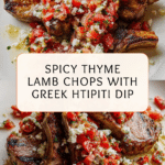 Succulent lamb chops marinated with fresh thyme, chili flakes, and olive oil, grilled to perfection and served with a flavorful Greek htipiti sauce made from roasted red peppers, feta, garlic, and spring onions. This vibrant dish combines Mediterranean flavors in a simple yet elegant meal.