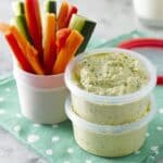 The image shows two small clear plastic containers stacked on each other filled with a creamy, light green dip that looks thick with visible herbs mixed inside. Next to the containers is a small white cup filled with fresh vegetable sticks including orange carrots, red bell pepper, and green cucumber arranged vertically. The items are placed on a light green cloth with white polka dots, all on a white marbled surface. In the background, a glass of milk is partly visible. Photo taken with an iphone --ar 4:5 --v 7