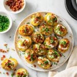 Keywords: mini baked potatoes, loaded potatoes, baby potatoes, sour cream, bacon bits, chives, appetizer, side dish, easy potato recipe
