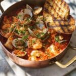 Keywords: Mediterranean fish stew, halibut stew, seafood stew, garlic toasts, ciabatta garlic bread, white wine seafood, halibut recipes, prawn and clam stew, summer seafood dish