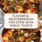This Mediterranean fish stew bursts with fresh flavors from halibut, clams, and prawns, simmered in a rich tomato and white wine broth. Served with crispy garlic toasts, it makes a perfect comforting meal that’s both elegant and easy to prepare.