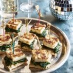 - Assemble the bites: Spread an even layer of the spiced spinach mixture over each warmed naan bread. Distribute the grilled halloumi cubes evenly on top of the spinach. Cut the bread into bite-sized pieces that fit the cheese and secure each piece with cocktail sticks.