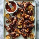 - Serve: Plate the grilled chicken with the charred lime halves for squeezing over and the reserved barbecue sauce for dipping.